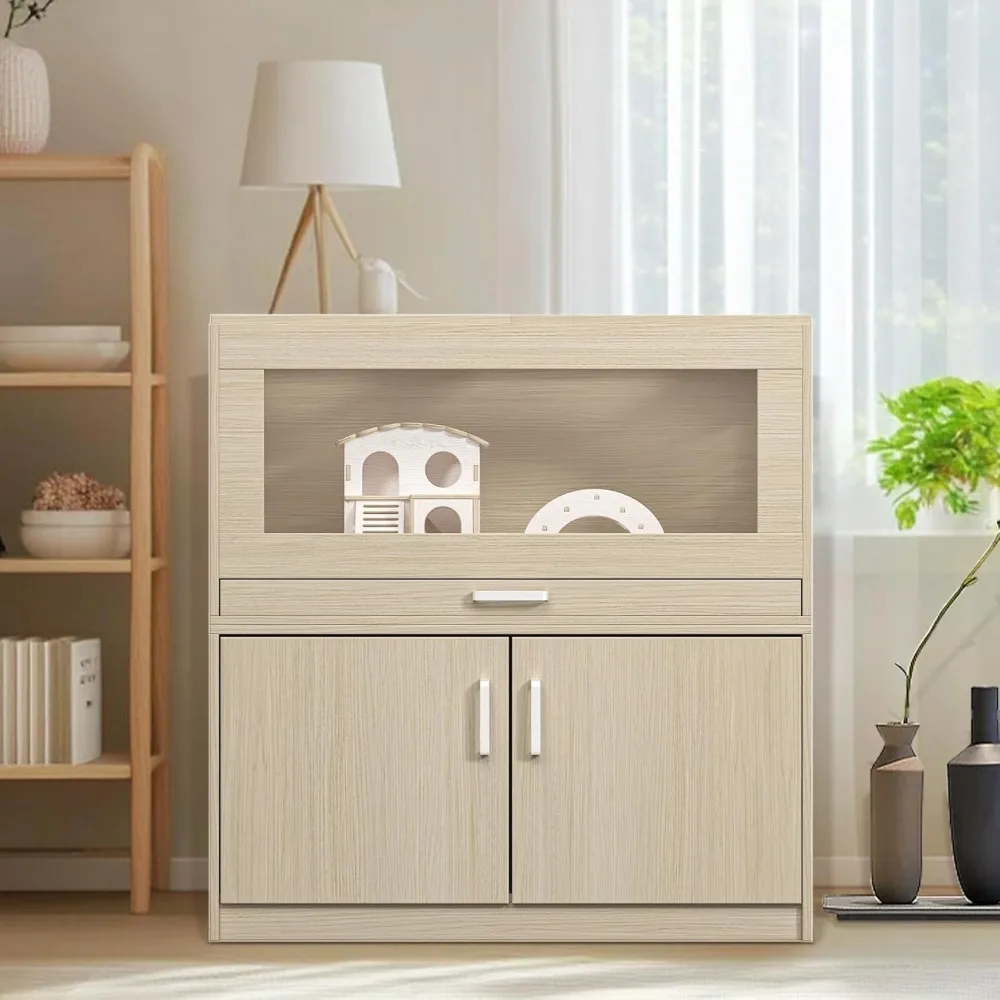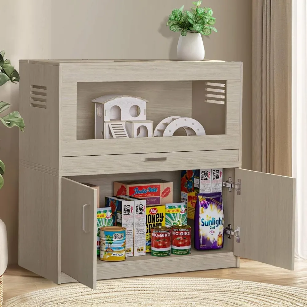 Hamster Cage With Independent Storage Cabinet, Wooden Enclosure for Guinea Pigs, Rats, Hedgehogs - Acrylic Windows, Teak