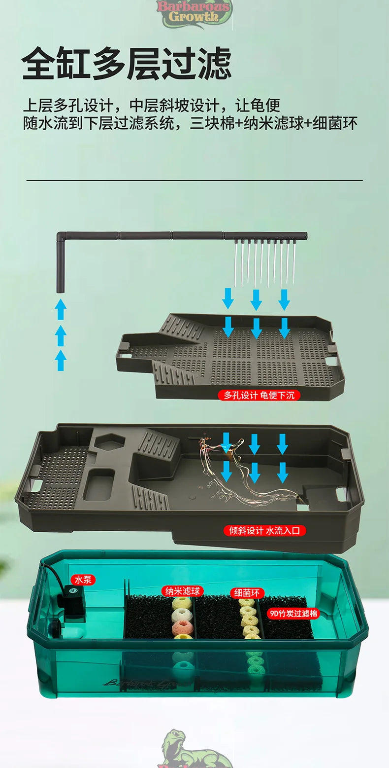 The upper layer adopts a porous design to ensure air circulation. The middle layer is equipped with a slope design to help the turtle easily flow down the water and enter the filtration system on the lower layer, making it easier to clean and maintain the entire tank and keep the water fresh.