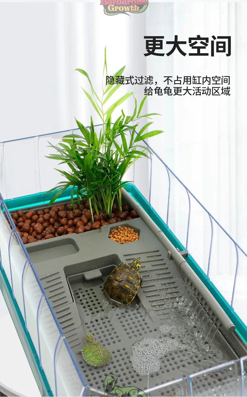 The hidden filtration does not occupy the activity space in the tank, ensuring that the turtle has a larger range of activities and allowing small pets to move freely in a spacious environment. At the same time, the filtration system effectively keeps the water clean, reduces the frequency of maintenance, and saves maintenance time.