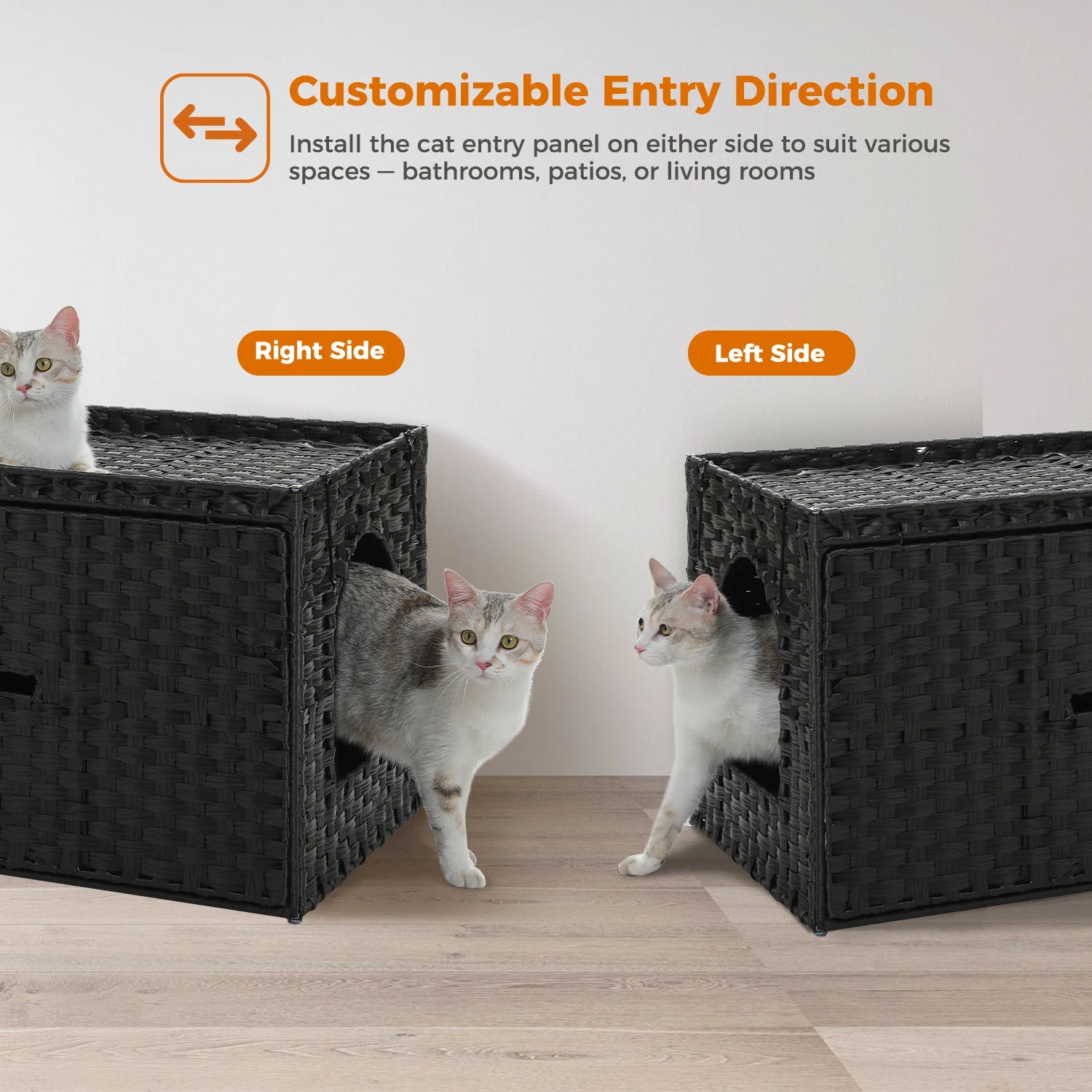 Each cat litter box enclosure is meticulously handwoven from waterproof, washable PVC rattan. The natural texture adds warmth to your space while providing a sturdy, easy-to-clean home for your feline friend. A removable washable litter mat is included to protect your floors right away and simplify maintenance.