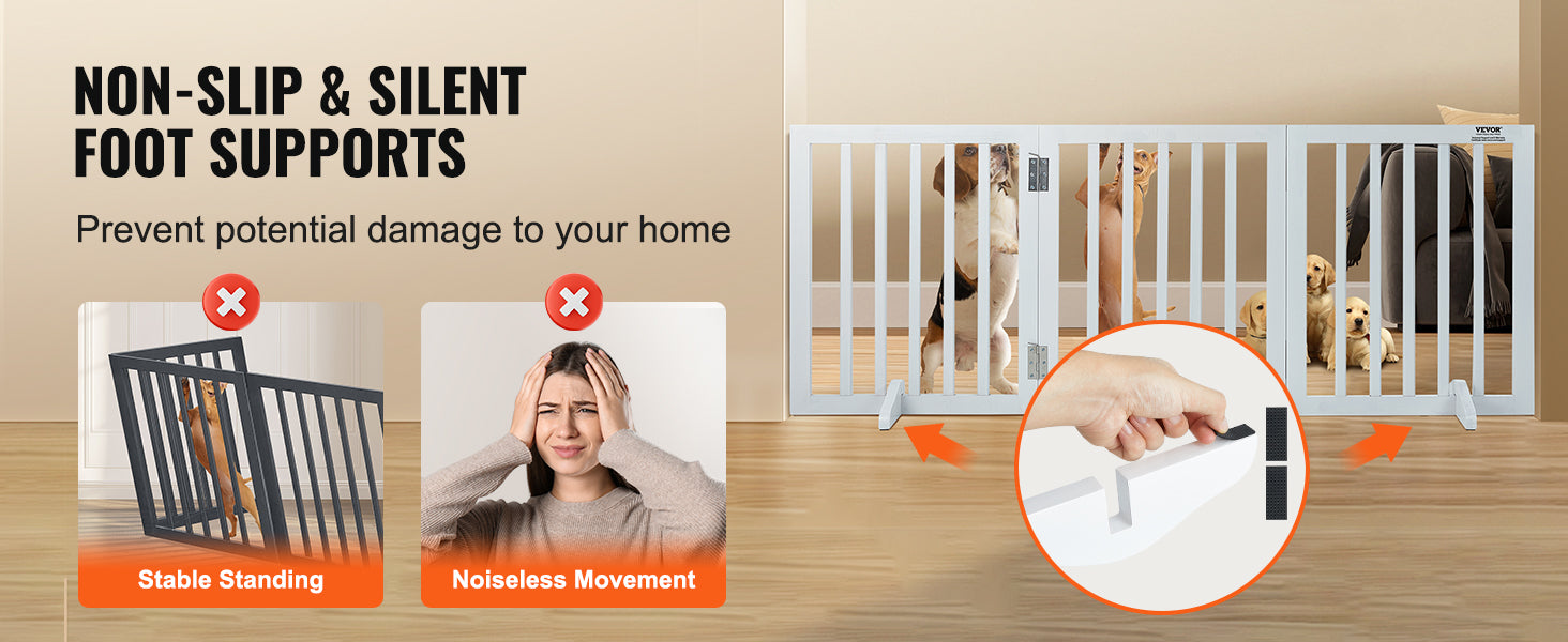 - Stable and floor-friendly — Two anti-slip foot supports keep the gate steady in all positions, while silent foot pads protect floors and reduce noise.
