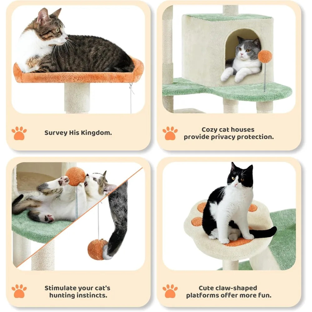- Cute Cat Paw Design: Highlighted by an eye-catching appearance, this cat climbing tower blends beige, orange, and green hues. Its playful cat paw-shaped edge design flawlessly combines its irregular layout, adding a vivid element to this charming piece