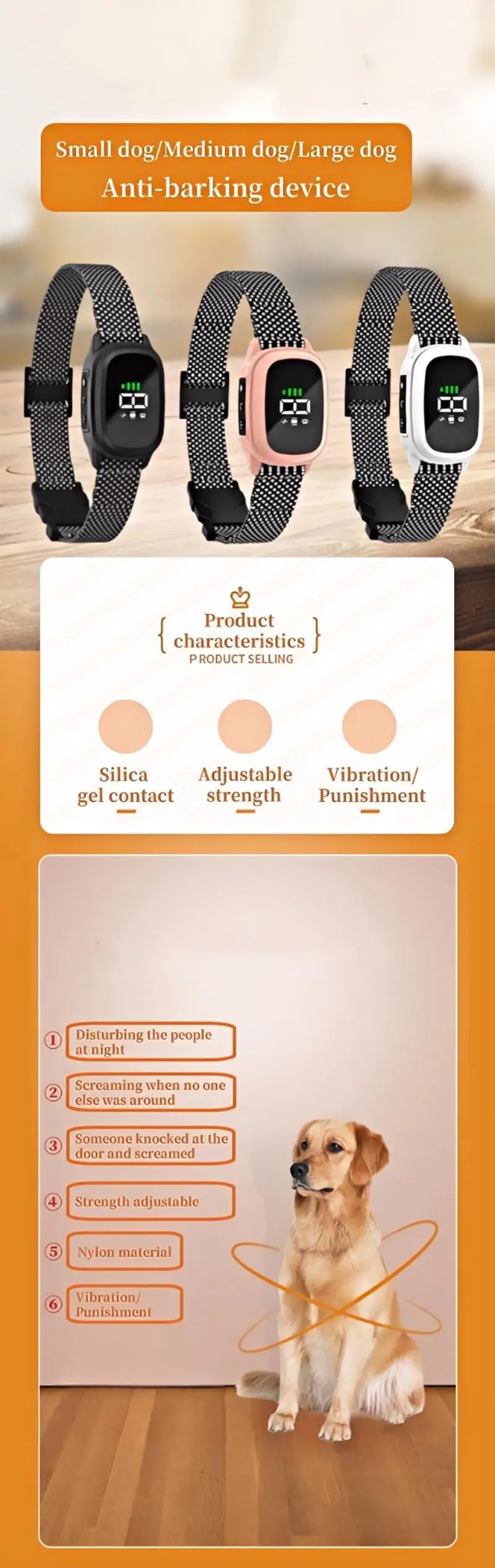 - Automatic anti-barking system: stops your pet's barking without manual intervention, promoting calm at home and during walks.